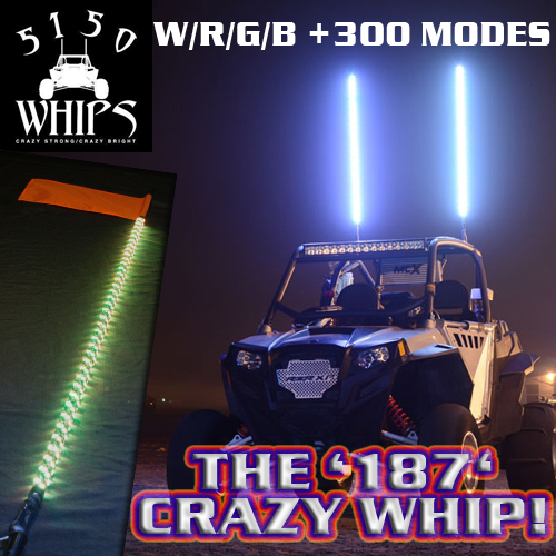 5150 Whips was started by life long off-roaders to create the strongest, brightest, most versatile, and easiest to mount multicolored lighted LED Whips in the industry. After being tired of replacing the traditional one color plastic straw whips once a season, 5150 whips was born to outlast and outshine the competition.